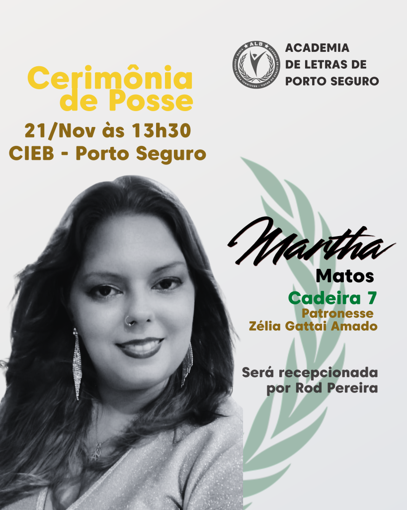A Academia de Letras de Porto Seguro realizará, no dia 21 de novembro, às 13h30, no CIEB – Porto Seguro, a posse solene da professora, escritora e pesquisadora Martha Matos, ocupante da Cadeira nº 7, cuja patronesse é Zélia Gattai Amado. Embora já seja integrante do quadro de imortais da instituição, a cerimônia representa o reconhecimento público de sua trajetória e fortalece o compromisso da ALPS com a ampliação de vozes, perspectivas e horizontes literários na cidade e na região. Martha Matos construiu uma caminhada marcada pelo entrelaçamento entre ancestralidade, educação, espiritualidade e práticas decoloniais. Mestra em Ensino e Relações Étnico-Raciais pela UFSB e atuante no CIEB-PS, ela entende a escrita como gesto de cura, pertencimento e reconstrução de memórias historicamente silenciadas. Atendendo a um pedido especial da autora, o local e o horário da cerimônia foram definidos de modo que Martha pudesse compartilhar este momento com seus alunos, reafirmando a centralidade da educação em sua vida e a importância da presença dos jovens como parte ativa da cena literária local. Que eu honre o silêncio e o som, a sombra e a luz — tudo aquilo que fez de mim escritora; e que, sendo uma noctívaga da palavra, eu percorra as madrugadas da memória recolhendo o que o dia não vê, o que não pode ser perdido, transformando lembranças em palavras de ancestrais. Que cada fragmento encontrado nesse entremeio se torne literatura, acendida com o mesmo gesto terno com que Zélia Gattai iluminava o mundo a partir das pequenas coisas, para que também eu possa atravessar o tempo. Martha Matos Sua obra amplia o repertório da Academia ao trazer narrativas profundamente conectadas à diversidade cultural, religiosa e étnica da região, consolidando o propósito da instituição de acolher múltiplas expressões literárias e fortalecer o diálogo entre tradição, contemporaneidade e comunidade. “A presença de Martha na Academia simboliza o que defendemos uma literatura múltipla e também profundamente ligada à identidade do nosso território, conectando saberes, memórias e futuros por meio da força das palavras.” Rod Pereira, Presidente da Academia A cerimônia será conduzida pelo próprio presidente, que fará a recepção oficial da autora. Aberto ao público, o evento reafirma o papel da ALPS em aproximar escritores, leitores, estudantes e pesquisadores, estimulando a participação ativa da sociedade na construção da identidade literária de Porto Seguro. Serviço📅 21 de novembro (Sexta-feira)🕝 13h30📍 CIEB – Porto Seguro